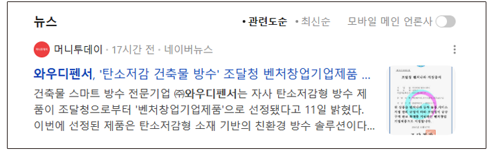 ㈜와우디펜서는 자사 탄소저감형 방수 제품이 조달청으로부터 '벤처창업기업제품'으로 선정되었습니다.